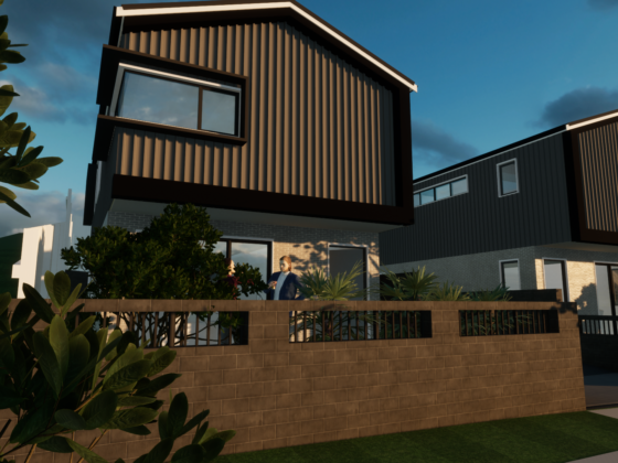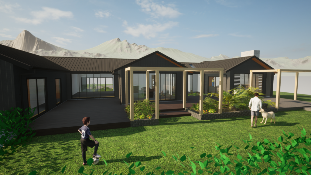 Develop an ideal home design for larger sections that embraces an outdoor-centric lifestyle. The design should offer a unique layout that prioritizes sheltered outdoor spaces, providing shade and comfort against the sun’s rays. With a focus on spacious living, the residence comprises three generously sized bedrooms and a guest room complete with its own ensuite.