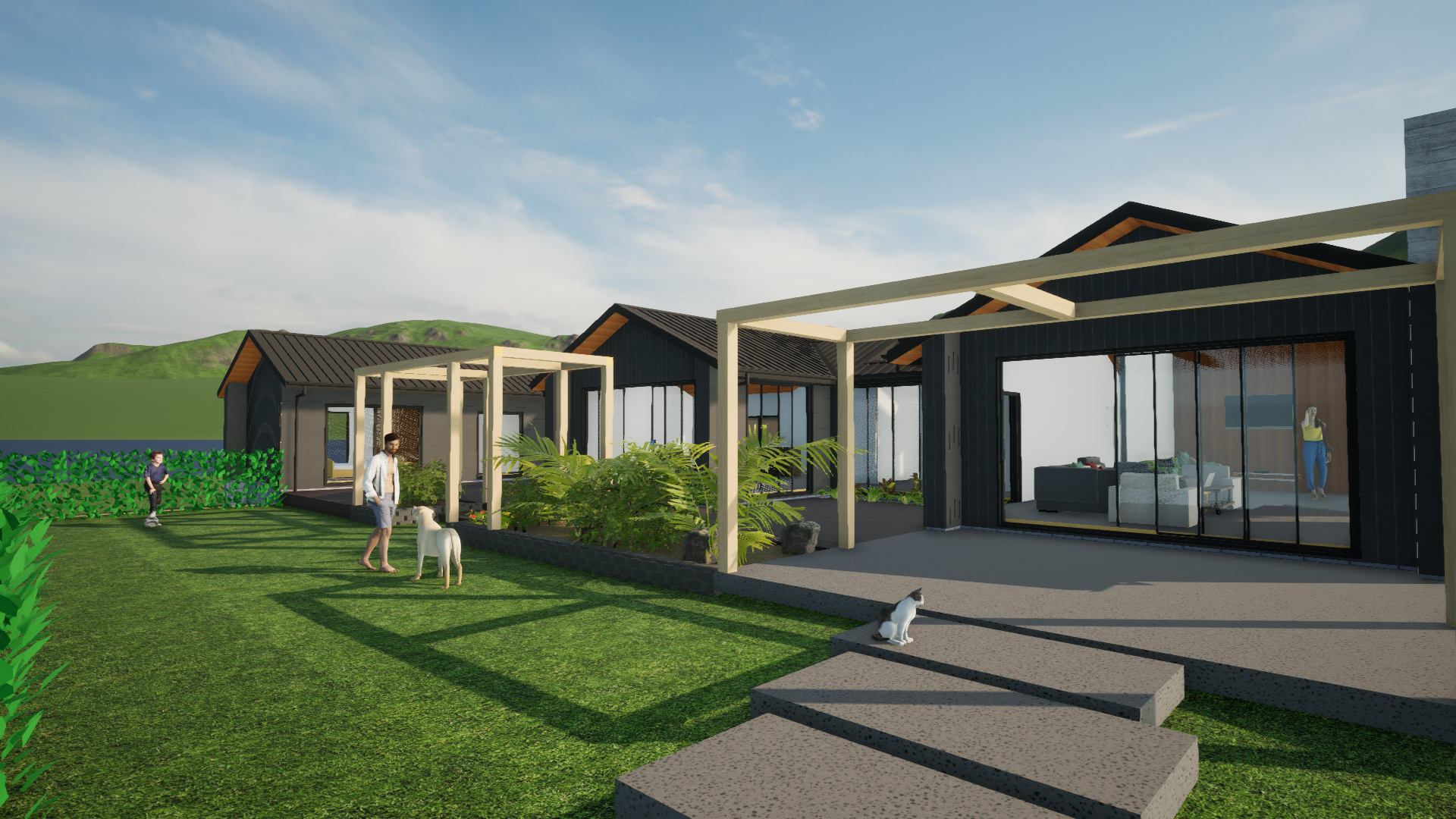 Develop an ideal home design for larger sections that embraces an outdoor-centric lifestyle. The design should offer a unique layout that prioritizes sheltered outdoor spaces, providing shade and comfort against the sun’s rays. With a focus on spacious living, the residence comprises three generously sized bedrooms and a guest room complete with its own ensuite.