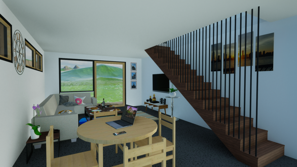 Design an inviting two-level duplex home with three bedrooms that combines optimal space utilization with functional layout planning. The ground floor seamlessly integrates an open-plan kitchen, dining, and lounge area, fostering a sense of togetherness. The upper level features three bedrooms, highlighted by a master suite with its ensuite bathroom, accompanied by a family bathroom.
